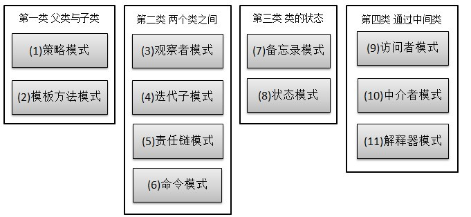行为型模式,共十一种:策略模式、模板方法模式、观察者模式、迭代子模式、责任链模式、命令模式、备忘录模式、状态模式、访问者模式、中介者模式、解释器模式。